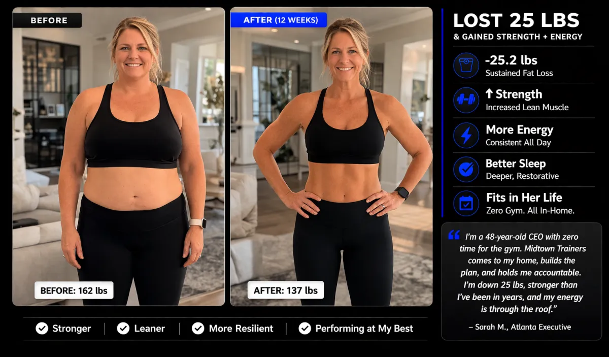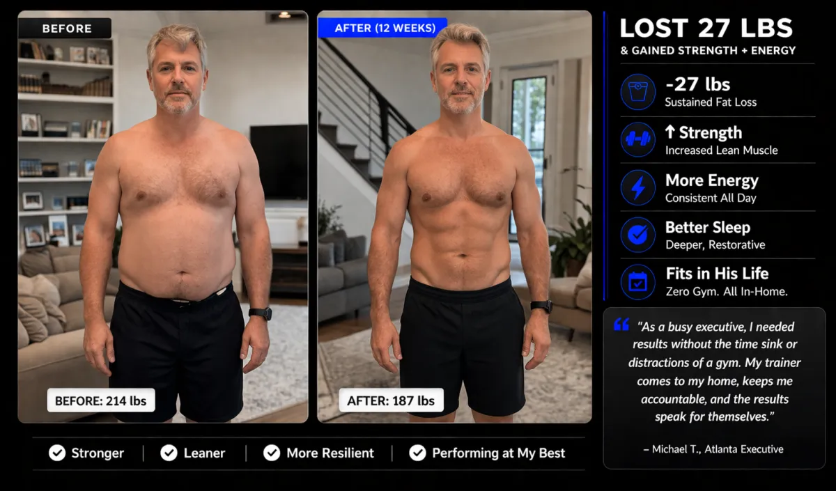 We deliver concierge in-home training + precision nutrition directly to your door in Midtown Atlanta and surrounding areas. No gym. No wasted time. Just results that show up in the boardroom, on the golf course, and in how your clothes fit.